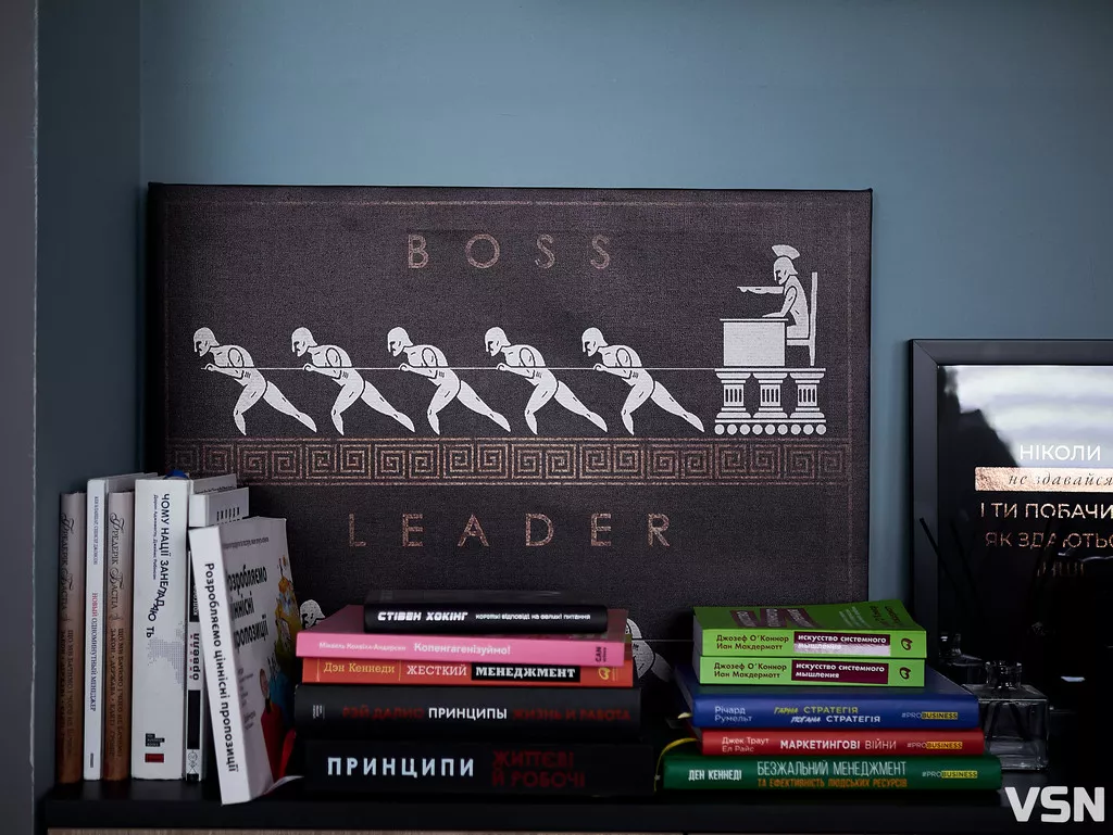 (На полиці під картою громад у сірому на колір, мінімалістичному, але з яскравими деталями просторі мера стоїть шеренга книг. Трохи не схожа на звичні «кабінетні» шеренги. Щось стоїть, що лежить. Хаос — так, як би ці книжки лежали вдома. Без Святого Письма, пафосних літописів державної влади, тощо. Натомість — Орвелл, Стівен Хокінг, Річард Румельт…)