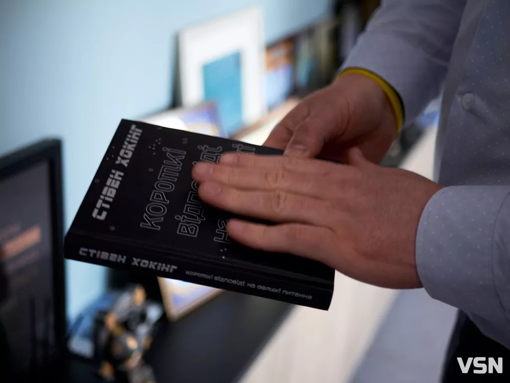 … «Це — подарунок від Оксани Киричук (перебираємо книжки, які тут є, і я так не розумію, що з цього подарунок, чи Орвелл і його «1984», чи «Жесткий менеджмент» коуча Дена Кеннеді, чи «Чому нації занепадають» Дарона Аджемоглу та Джеймса Робінсона). Це — Стівен Хокінг, легендарний англійський астрофізик. Він там питання задає про Бога, виникнення Всесвіту і таке різне… Нормально».