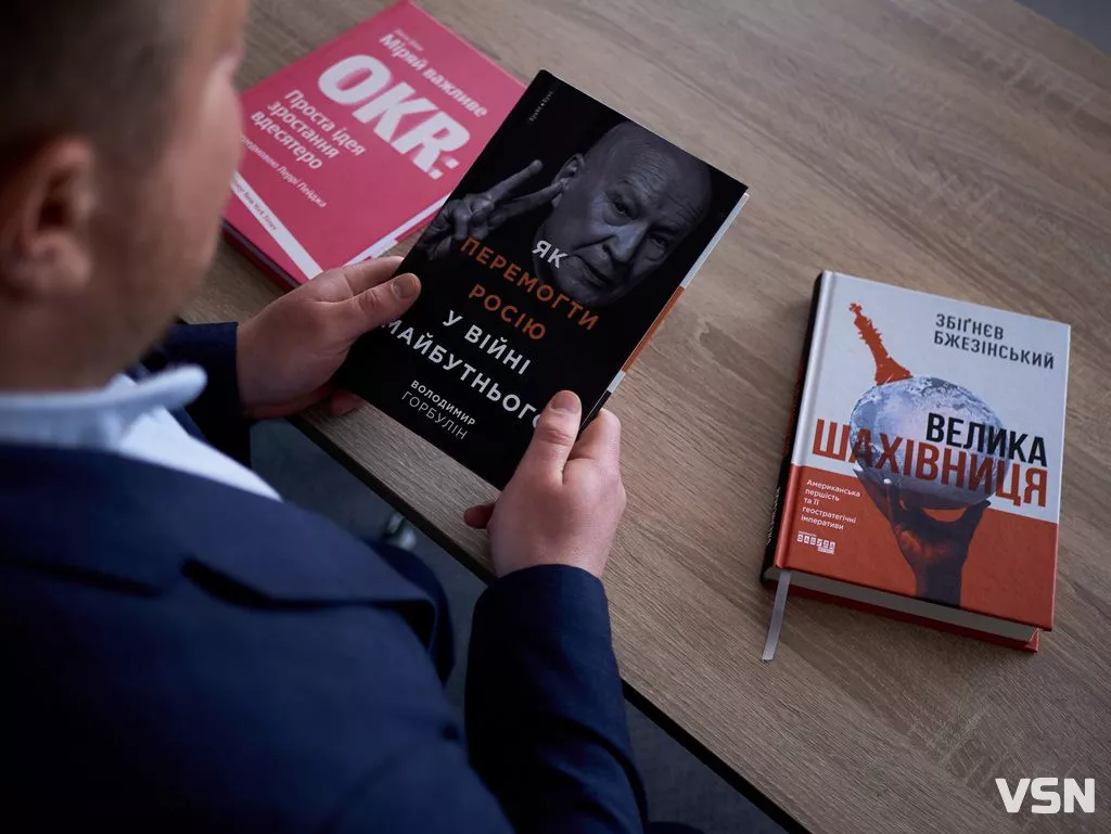 … «Це теж геть недавно подарували. Горбулін — радник чотирьох наших президентів. Почав її читати. 2021 року, актуалочка. Якщо людина, яка здійснює процеси управління в цій країні, не читала ці книжки, з нею в принципі немає про що говорити. Треба розуміти, куди ми рухаємося».