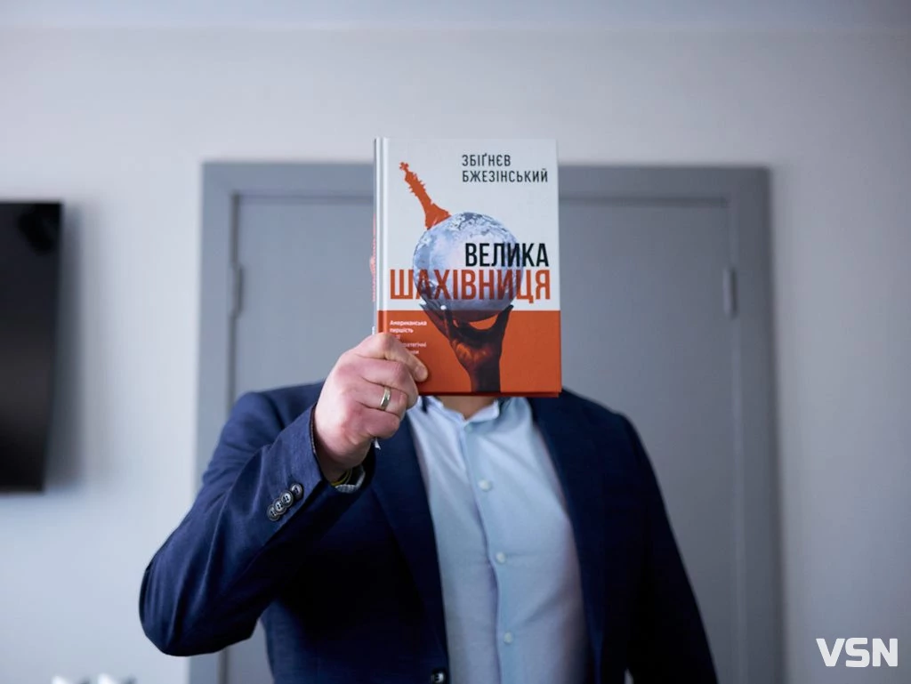 (Серед кількох книг, які Карпус не десь там на полиці, а тримає під рукою — зліва біля столу, бо, очевидно, найсвіжіші – Збігнєв Бжезінський. Резонансна, у яскравій палітурці «Велика шахівниця. Панування Америки та її геостратегічні імперативи», в якій автор, американський політолог та письменник, соціолог та поляк за національністю, який був радником одного з президентів США із питань національної безпеки, писав і про особливе значення та роль на геополітичній шахівниці України як держави, яка зреклася «більш ніж 300-річної російської імперської історії»).