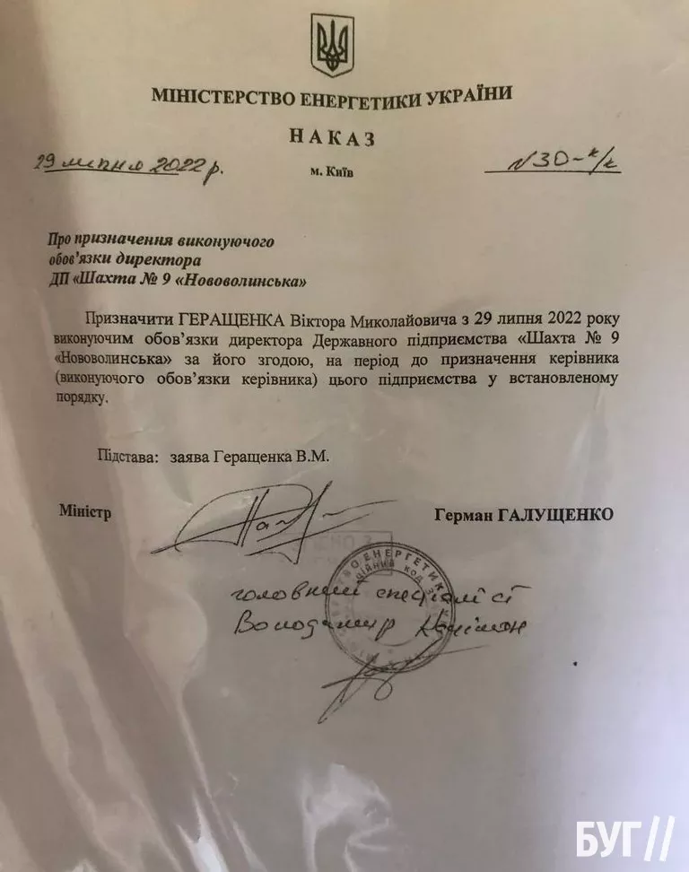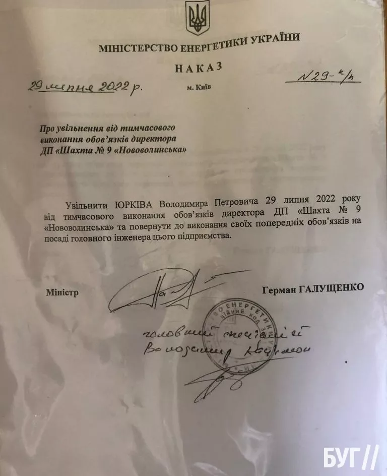 Нагадаємо, 29-го липня за підписом Міністра енергетики України на нову посаду виконувача обов’язки керівника шахти №9 «Нововолинська» призначили Віктора Геращенка. Дізнавшись про це, ще діючий директор Володимир Юрків взяв лікарняне. На його увільнення від займаної посади уже також прийшов наказ, Юрківа хочуть повернути на раніше займану посаду головного інженера копальні.