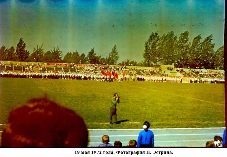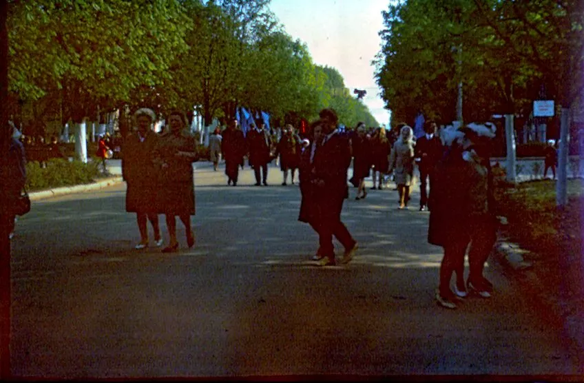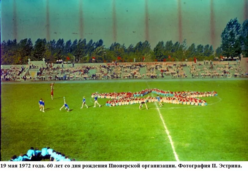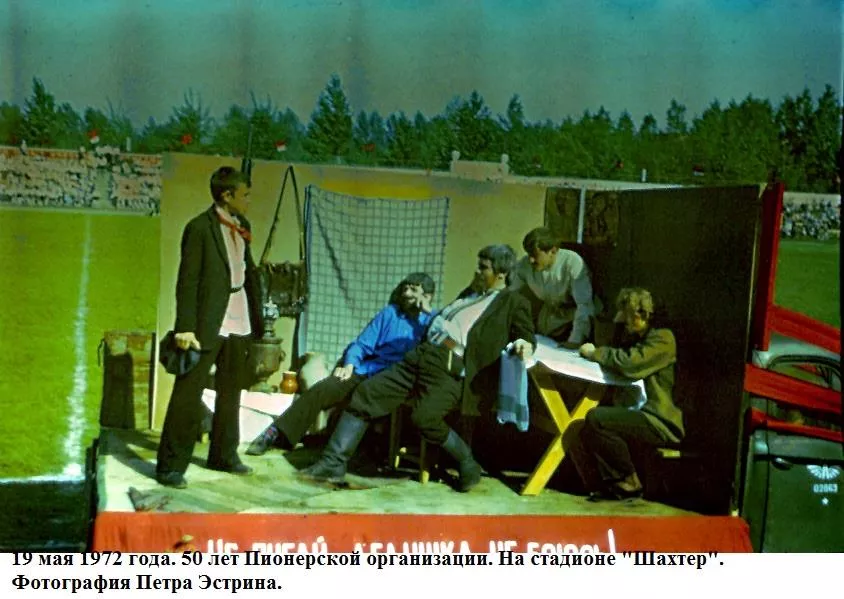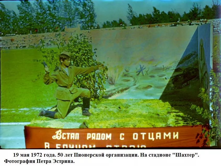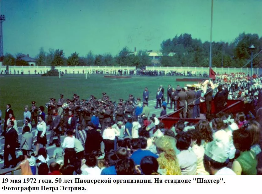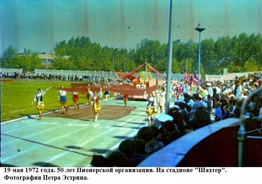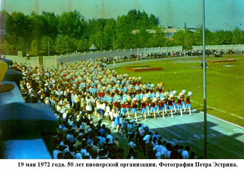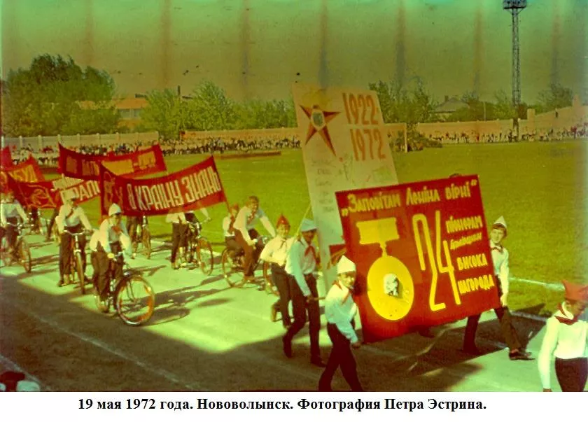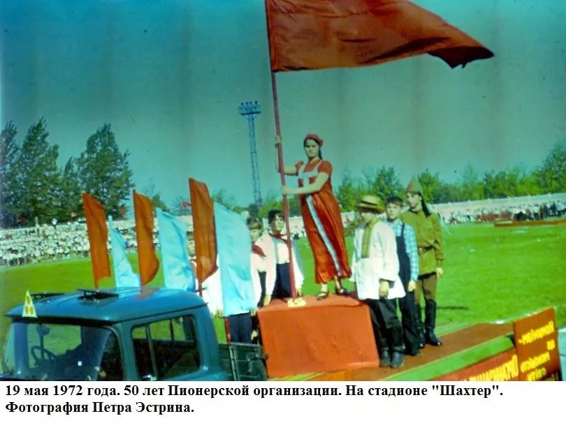Травень весняний, мінливий, теплий з грозами і зливами, все вже наливається силою і хліба і буряк і люді.Май – час свят. 19-го в п’ятницю тиждень тому країна відзначала 50-річчя з дня утворення піонерської організації. Було велике свято, в усякому разі, діти це відчули. Були концерти – і по телевізору, хороші і взагалі. У п’ятницю в Нововолинську не вчилися, був гарний день, теплий, спекотний і хороший піонерський народ. Потім на стадіоні – лінійка урочиста (правда, як у нас водиться багато промов), винос прапора, сцени на машинах з історії піонерії – Павлик Морозов, Валя Котик, син полку і інші, виступи і танці. Я намагався фотографувати. Море різних кольорів: синіх і червоних, білих і блакитних. Море посмішок і краватки, краватки, краватки. Краватки навіть на дорослих. Увечері був багаття. Я теж його фотографував на кольорову плівку. 50 років Радянської Піонерії пройшов святково і урочисто. Лена була в червоній пілотці, в краватці і зі зробленим матусі ромашкою.”