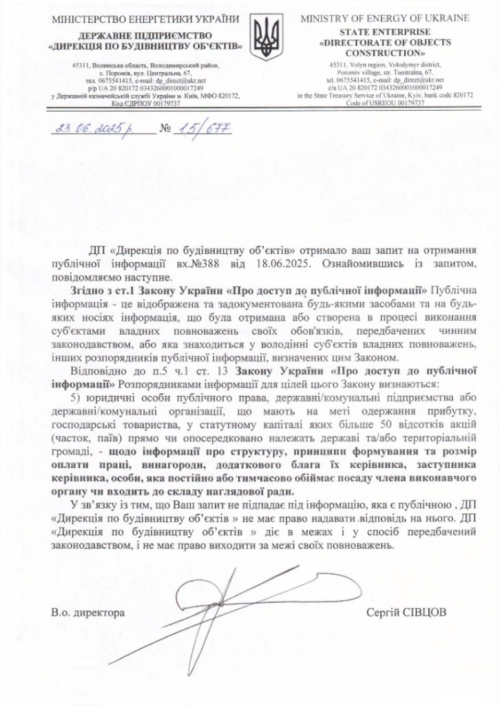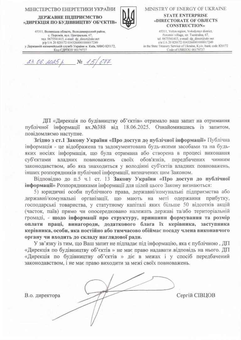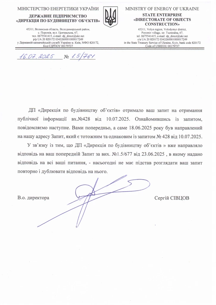 Отримано відповідь підписану в.о. директора Сівцовим — мовляв, підприємство
