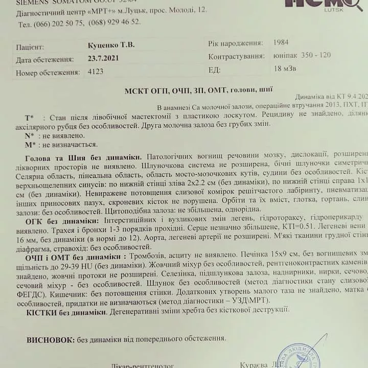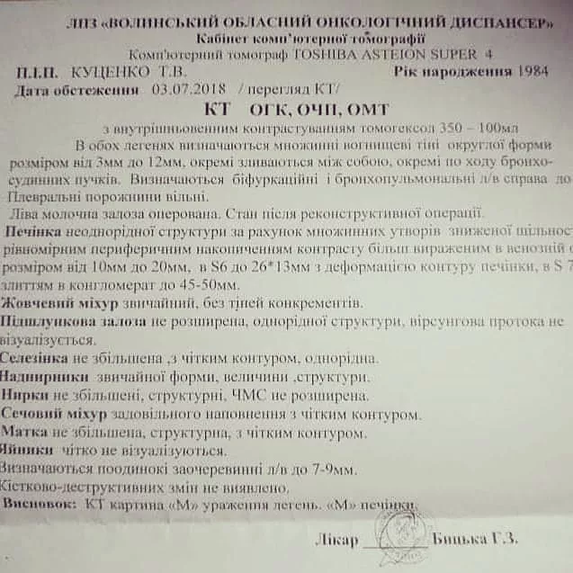 “Я прожила і так вже багато для останньої стадії, таку думку мені сказала людина, напевно, не подумавши. Дійсно лікар давав 4 місяці з огляду на метастази множинні в печінці та легенях. Але я не могла змиритися, шукала постійно”, – йдеться у повідомленні.
