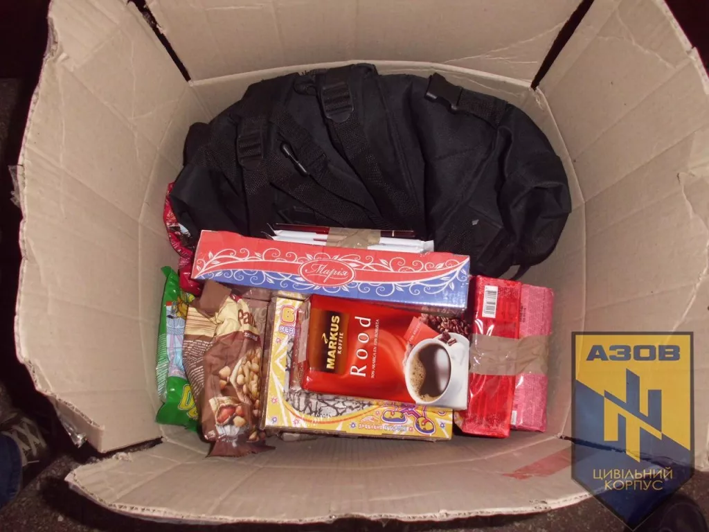 В посилку для побратимів Дикого,Шеви,Макса і Немца молоді бійці Цивільного Корпусу “Азов” принесли смаколики які придбали за власні кошти для побратимів.