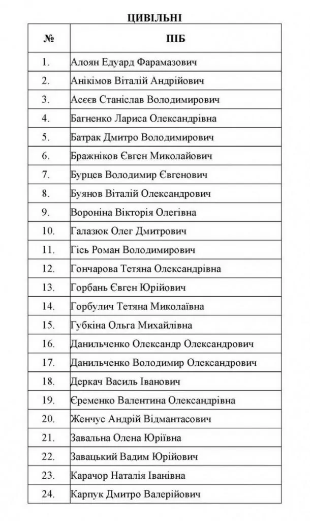 Повний список з усіх 76 звільнених українців був опублікований СБУ. У результаті обміну на Батьківщину повернулися, зокрема: 12 військовослужбовців (три з яких знаходились у місцях позбавлення волі на території ОРДЛО з 2015 року); 64 цивільних (сімнадцять з яких утримувались з 2015–2016 років).