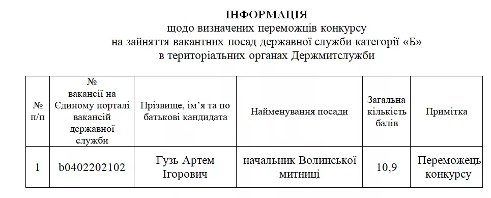 Днями завершився конкурс на вакантну посаду начальника Волинської митниці. За результатами останньої співбесіди перемогу здобув Артем Ігорович Гузь.