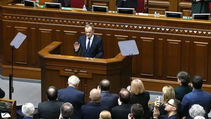 Голова Європейської ради Дональд Туск виступив у Верховній Раді України українською мовою з нагоди п’ятої річниці подій на Майдані. "Я прибув до вас у 5-ту річницю драматичних подій на Майдані, у річницю Революції Гідності, щоб подякувати всім українцям та їхнім обранцям, незалежно від партійних розбіжностей. Я ...