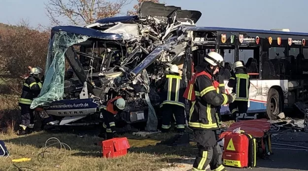 Два шкільних автобуси зіткнулися в баварській комуні Аммерндорф на півдні Німеччини, в результаті аварії серйозні травми отримали щонайменше п'ять осіб. Про це повідомляє Європейська правда з посиланням на німецьке видання Bild. Лобове зіткнення автобусів сталося на дорозі між містами Цирндорф і Аммерндорф ...