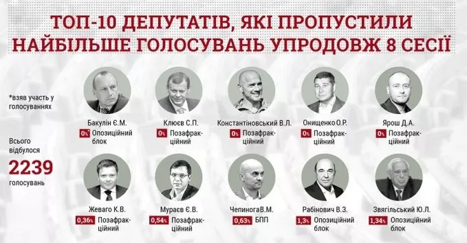 53 народні депутати пропустили 90% голосувань Верховної Ради упродовж восьмої сесії, яка тривала з лютого по липень. Про це пише 23 липня Комітет виборців України. Більшість із них є членами групи "Відродження" (11 осіб), "Опозиційного блоку" (15) та "Волі народу" (10). П’ятеро депутатів не проголосували (не ...