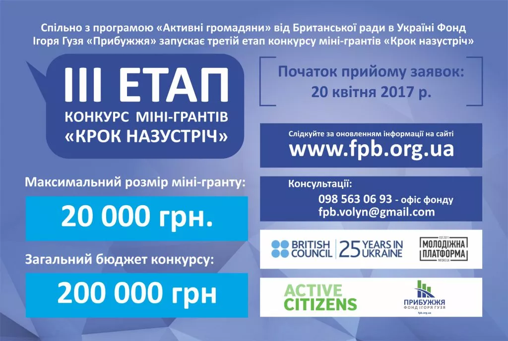 ФОНД Ігоря Гузя «Прибужжя» спільно з програмою “Активні громадяни” від Британської радив в Україні оголошує конкурс міні-грантів «Крок назустріч». Ціль грантового конкурсу: сприяти самоорганізації місцевих громад Любомльського, Іваничівського та Володимир-Волинського районів шляхом підтримки ініціатив громадських ...