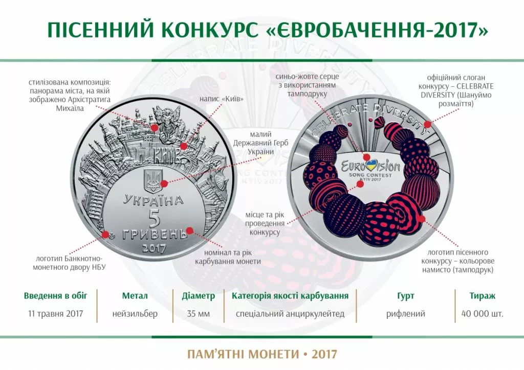 Національний банк України 11-го травня введе в обіг пам’ятну монету, присвячену проведенню 62-го пісенного конкурсу  «Євробачення-2017»  в Україні. Про це повідомляє сайт НБУ. Монета виготовлена з нейзильберу, має номінал 5 гривень, а ціна її реалізації становить 46 гривень за штуку. Половину тиражу ...