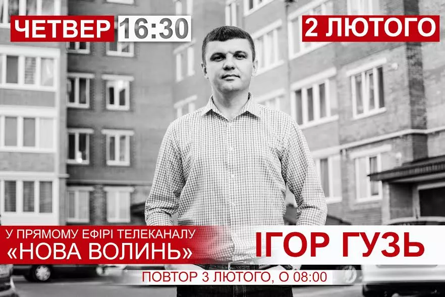 Народний депутат Ігор Гузь у четвер, 2 лютого, о 16:30 год.  виступить у прямому ефірів програмі «Ми вас обирали» Волинського телебачення. Обранець прозвітує про початок роботи у парламенті та завдання на поточний рік. Повтор – у п’ятницю, 3 лютого, о 8:00 год. ...