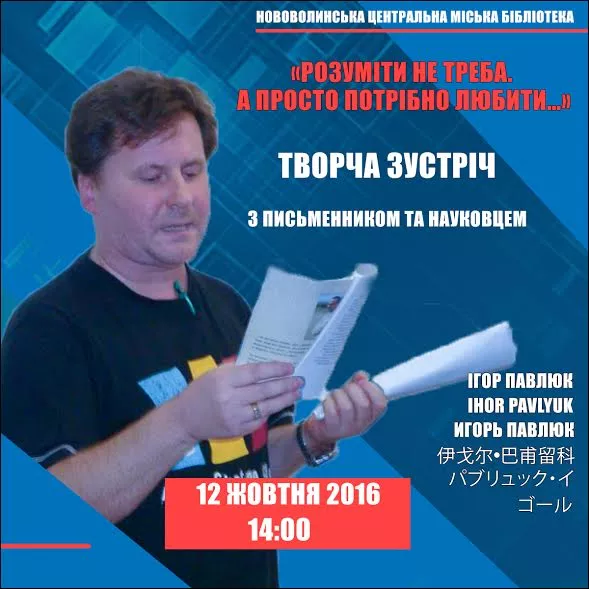 У Нововолинській центральній міській бібліотеці відбудеться творча зустріч з письменником, науковцем Ігорем Павлюком. З Волинського Полісся вимандрував у широкий світ поет Ігор Павлюк. Доктор наук із соціальних комунікацій, старший науковий співробітник відділу української літератури XX століття Інституту ...