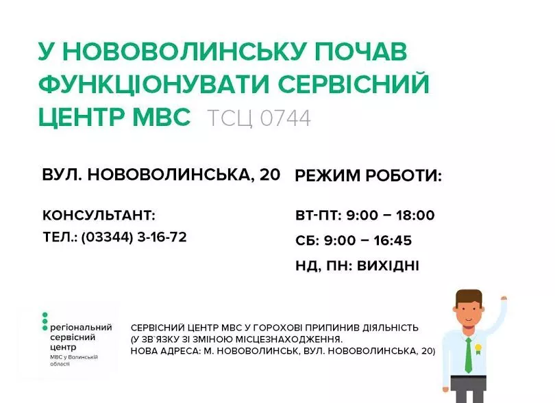 На численні прохання громадян відкрито сервісний центр МВС у місті Нововолинську. Відтепер відвідувачі можуть звертатися за отриманням необхідних послуг до ТСЦ 0744 за адресою : м. Нововолинськ, вул. Нововолинська, 20. Телефон для довідок : (03344) 3-16-72. Також повідомляємо, що у місті Горохові діяльність сервісного ...