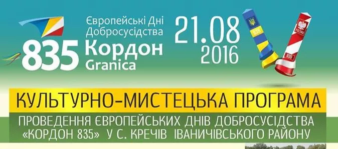 До вашої уваги культурно-мистецька програма Європейських Днів Добросусідства "Кордон 835", які відбудуться у селі Кречів 21-го серпня. Програма включатиме в себе: 10:00- Відкриття кордону 10:30- Початок спортивного фестивалю (міні футбол, пляжний волейбол, перетягування канату, метання колоди, гирьовий спорт та інше) ...