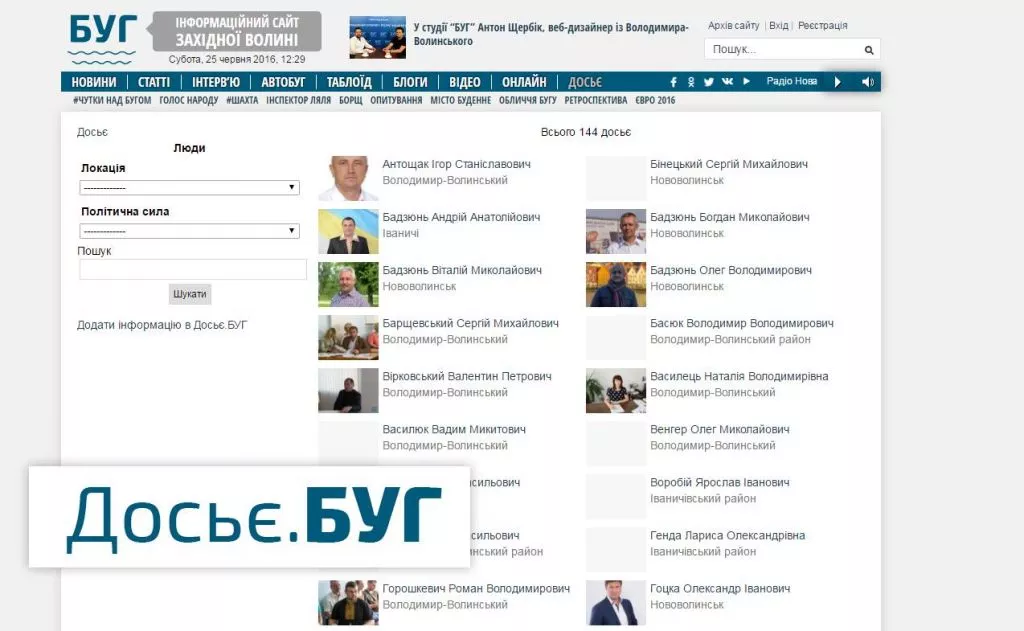На сайті інтернет-видання "БУГ" стартував новий розділ "Досьє", де в зручному для наших читачів вигляді відображаються інформація про публічних людей Прибужжя. В цьому розділі Ви можете знайти біографічні дані, контактні та заодно переглянути статті і новини про особу, що цікавить. Пропонуємо нашими читачами ...