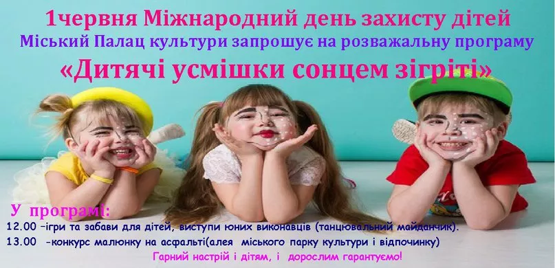 Міський Палац культури запрошує на розважальну програму  присвячену Міжнародному дню захисту дітей. У програмі: 12:00 - ігри та забави для дітей, виступи юних виконавців (танцювальний майданчик) 13:00 - конкурс малюнку на асфальті (алея міського парку культури та відпочинку) 14:00 - урочисте відкриття ...