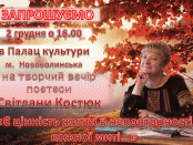 У Нововолинську, 2-го грудня відбудеться творчий вечір Світлани Костюк під назвою "Є цінність життя в неповторності кожної миті". Початок о 16:00 у міському Палаці культури. ...