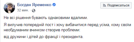 Про це йдеться на сторінці у фейсбук Богдана Яременка, – передає Українська правда.
