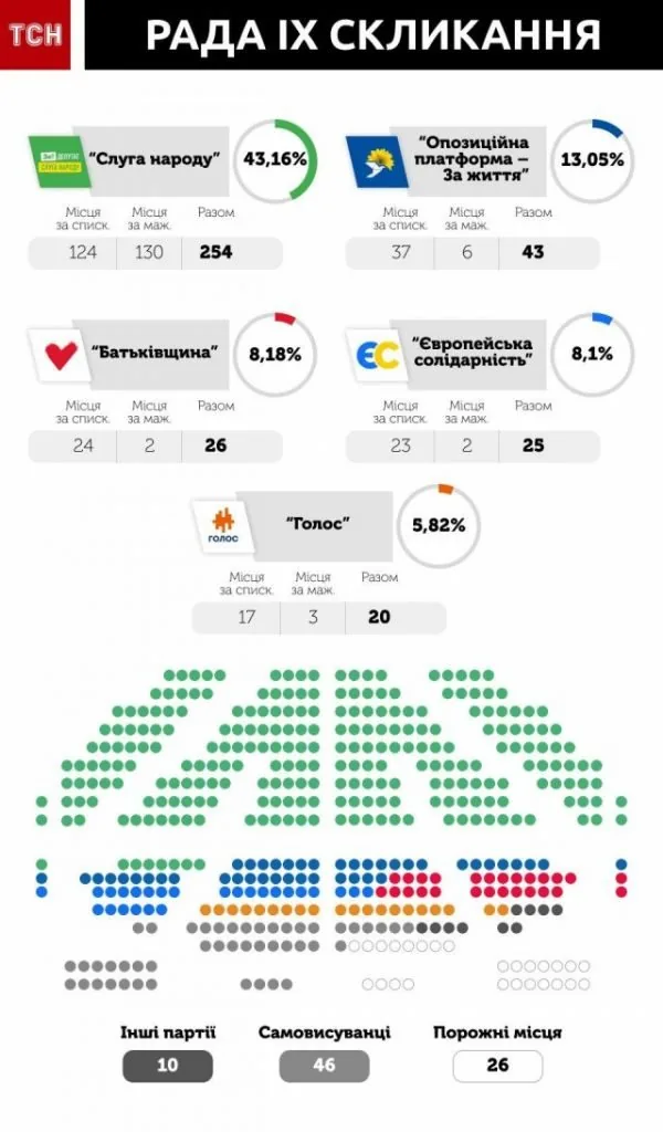 Зокрема, партія “Слуга народу” отримала 124 мандатів, партія “Опозиційна платформа – За життя” – 37, ВО “Батьківщина” – 24; партія “Європейська Солідарність” – 23; партія “Голос” – 17.