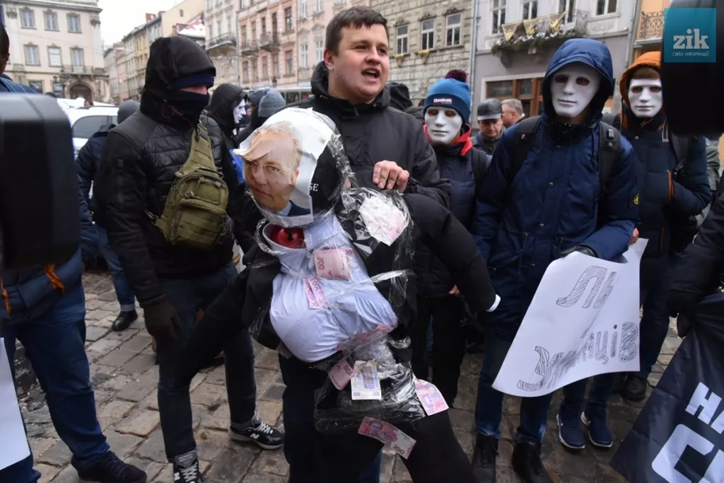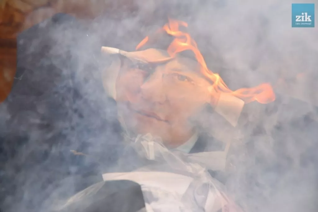Під Львівською Ратушею молодики в масках спалили опудало Садового