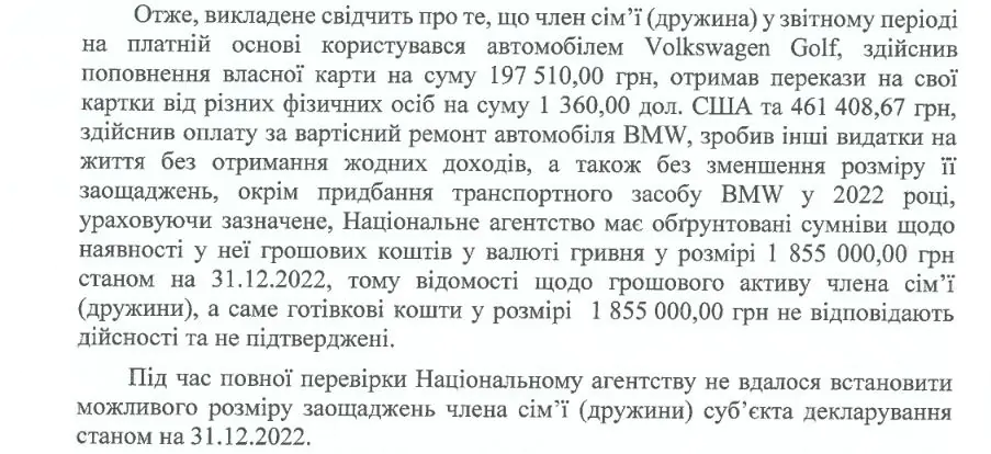 НАЗК також встановило, що Наталія Багатирчук у 2022 році здійснювала чимало банківських транзакцій, хоч і не мала доходів. Зокрема, жінка поповнювала свою картку на 197,5 тисячі гривень, отримувала перекази на майже 1,4 тисячі доларів та 461 тисячу гривень. При відсутності зарплати того ж 2022-го жінка витрачалася і на оренду іншої автівки Volkswagen Golf, але скільки сплатила, не вказала, бо документи начебто втратила через вторгнення РФ.