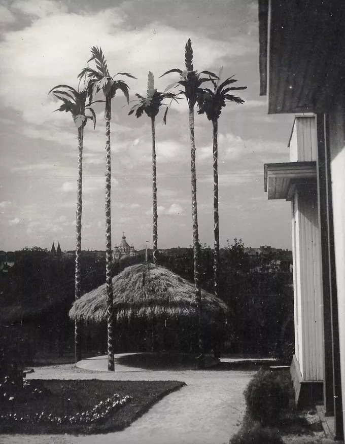 Ці пальми височіли перед одним із павільйонів Волинських Торгів, які традиційно відбувалися у Рівному у другій половині 1930-х років. Місцем проведення цієї найбільшої волинської виставки був фільварок князів Любомирських на Гірці, де тепер знаходиться парк ім. Тараса Шевченка. Фото: Роман ПАВЛЮК