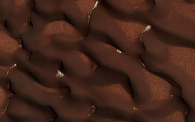 На фото можна побачити засніжені Марсіанські дюни і місце на Марсі, яке пов’язане з популярним голлівудським фільмом “Марсіанин”.