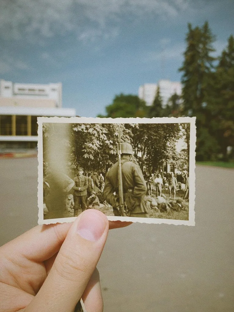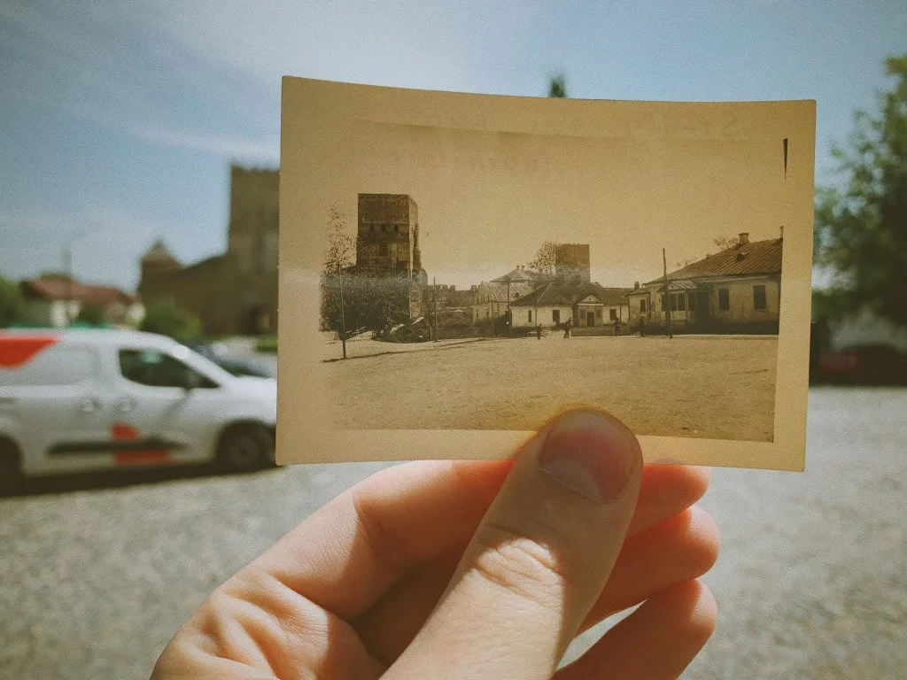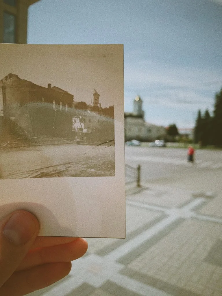 Аби було цікавіше і краще було порівняти колишнє і сучасне місто Артур спеціально сфотографував ретрофото на фоні нинішнього міста. Це робить фото ще магічнішим і цікавішим.