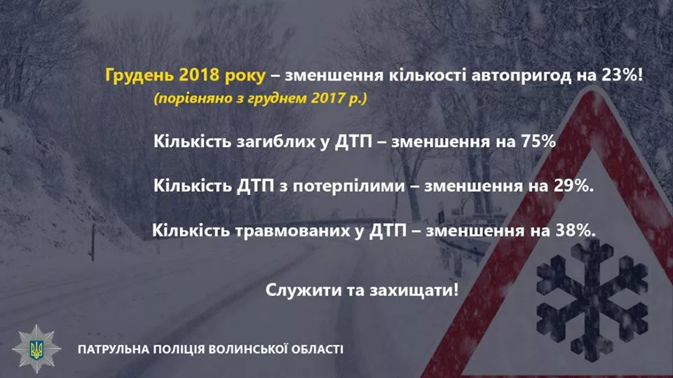 Якщо брати до уваги всю територію Волинської області, то кількість ДТП також зменшилась на 23%: минулоріч у грудні сталось 255 аварій, цьогоріч за останній місяць – 196.