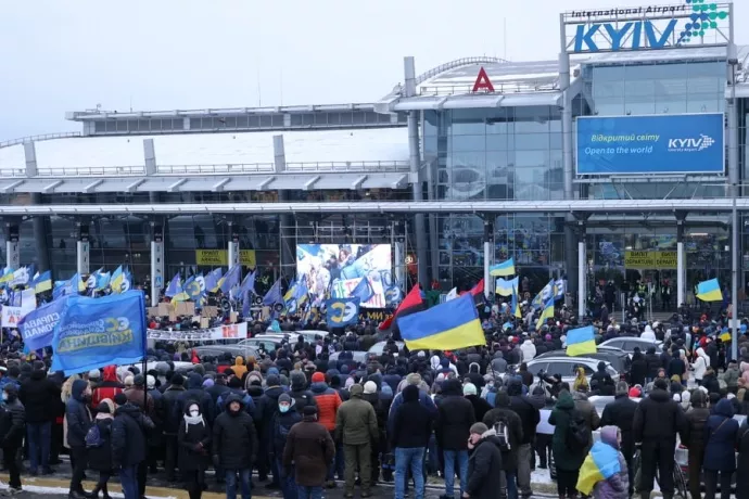 В цей час, у Києві, мітингувальники з партійною символікою групами стоять перед аеропортом. Люди вигукують “Зелю геть!”.