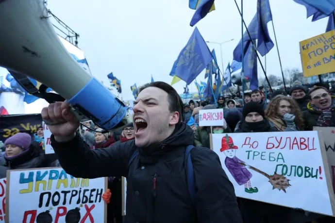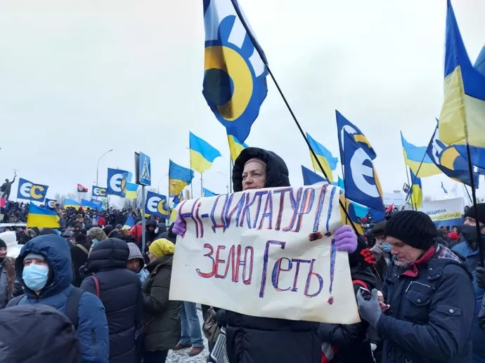 Вони тримають у руках плакати з гаслами: “Ні диктатурі”, “Україні не