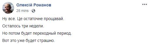 «Це остаточне прощай. Залишилося три тижні. Але потім буде перехідний період. Ось це вже буде страшно», – пише юрист Олексій Романов.