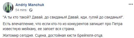 «А ти хто такий? Давай, до побачення! Давай, іди, гуляй до побачення!», Є враження, що якщо хтось із конкурентів запише про Петра відому мейхане, її заспіває вся країна», – написав журналіст.
