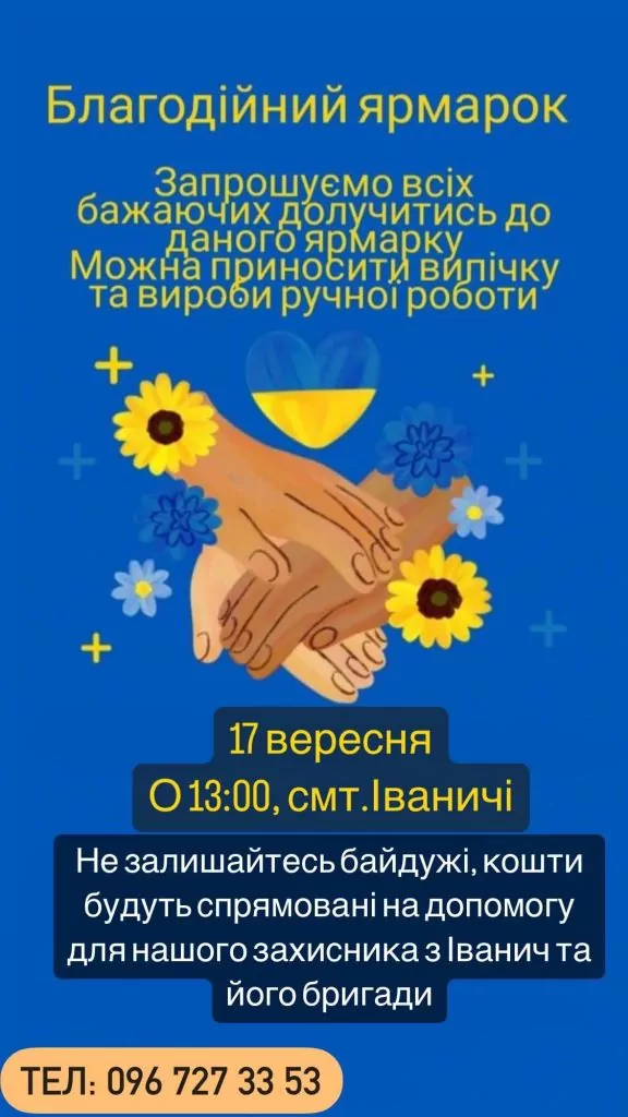 Мешканців Іваничівської громади та гостей з інших громад запрошують долучитися до благодійного ярмарку на підтримку ЗСУ, який відбудеться 17-го вересня о 13:00 на центральній площі селища.