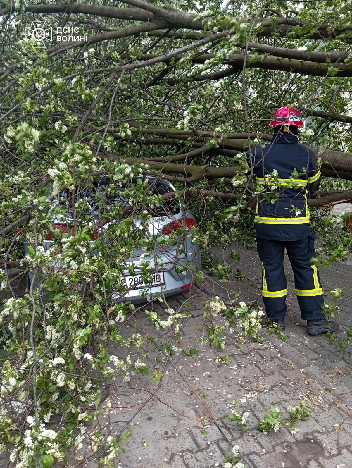 У Луцькому та Ковельському районах довелося прибирати повалені дерева. У Луцьку одне з них впало просто на припарковане авто.