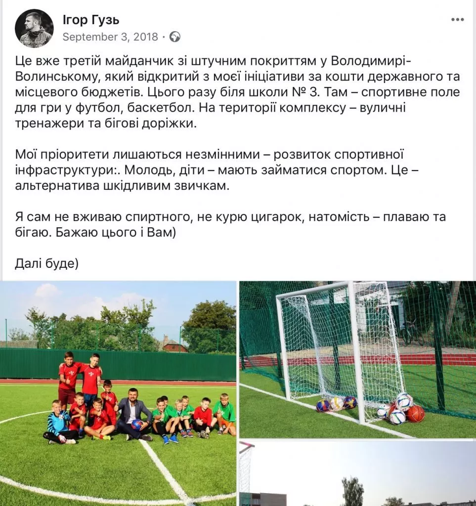 В окрузі Ігоря Гузя найбільше коштів торік витратили на капітальні ремонти дитсадків, шкіл, стадіонів тощо – 10,53 млн грн. Як уже зазначалося, значну частку має будівництво майданчиків – 5,75 млн грн. Окрім того, гроші спрямували на освітлення вулиць, придбання меблів та оргтехніки. Про використання цих коштів народний депутат регулярно звітує перед громадою та на своїй сторінці у Фейсбуці.