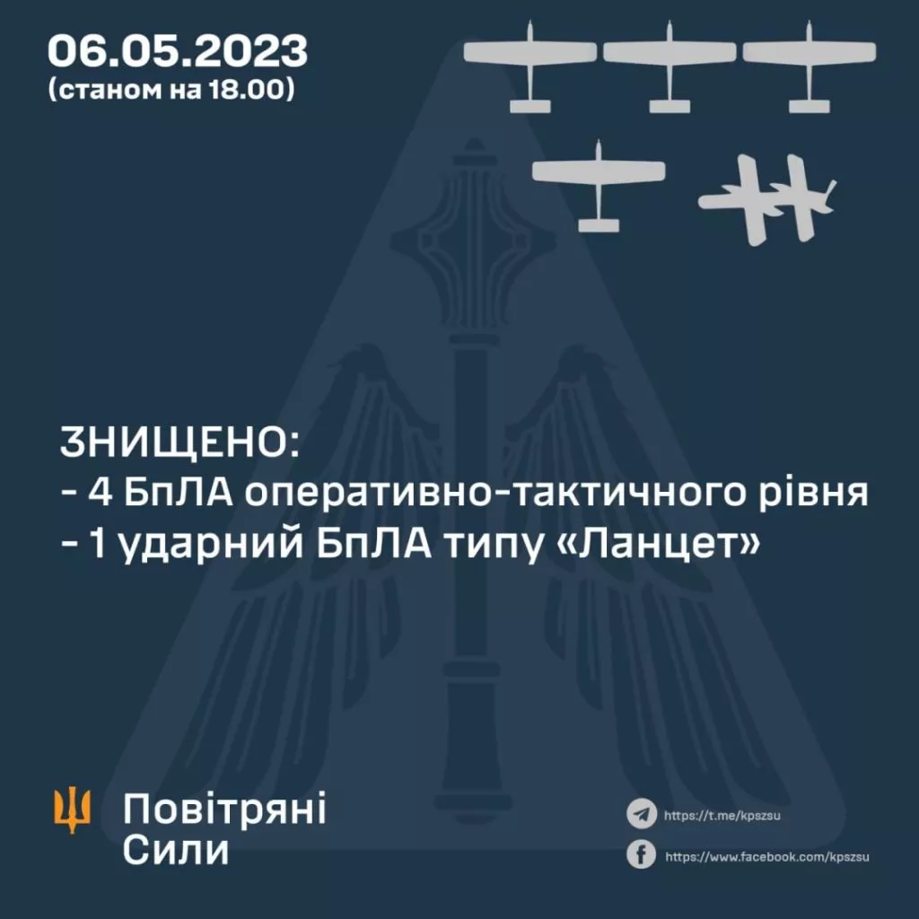 “Протягом дня 6-го травня силами та засобами протиповітряної оборони Повітряних сил ЗС України знищено п’ять ворожих безпілотників: чотири – оперативно-тактичного рівня та один ударний БпЛА типу “Ланцет”, – зазначив він.