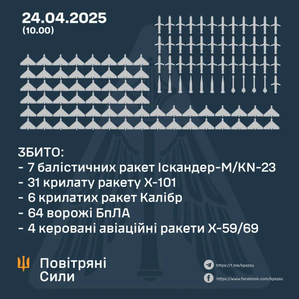 У ніч проти 24-го квітня сили протиповітряної оборони збили 48 ракет і 64 безпілотники, якими військо РФ атакувало Україну. Всього було 215 повітряних цілей.