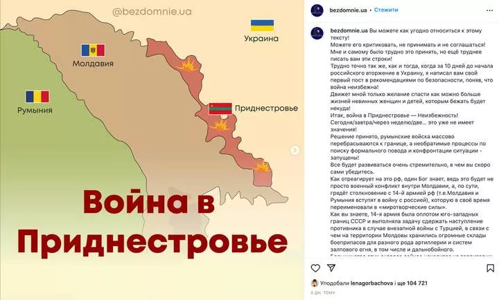 Ще один допис про ситуацію в невизнаному Придністров’ї нібито пояснював, що там насправді відбувається. Однак у дописі йшлося про те, що війна в Придністров’ї – неминуча, адже румунські війська нібито масово перекидають до кордонів. Українцям, які живуть біля кордону, радили «перебратися в більш безпечні місця». Такий допис, вочевидь, мав на меті посіяти паніку серед українців, які і так перебувають в умовах російсько-української війни.