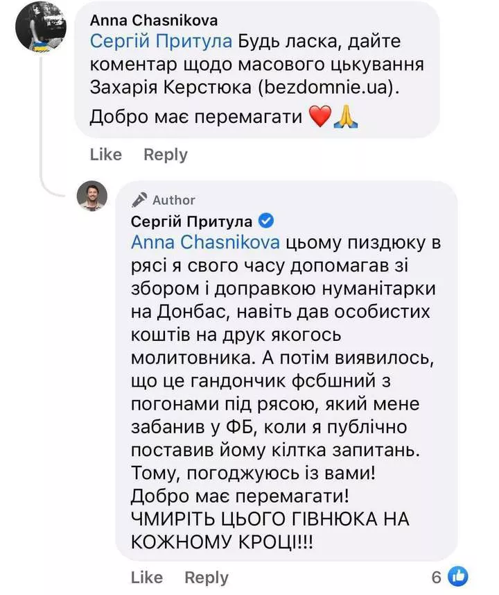 Після її публікації про Захарія Керстюка і діяльність його сторінки висловився відомий український волонтер та громадський діяч Сергій Притула. Відповідаючи на питання в коментарях до одного зі своїх постів він написав, що раніше також допомагав йому з доставкою гуманітарної допомоги на Схід. Однак згодом Керстюк заблокував його у Facebook після питань про його діяльність в УПЦ МП.