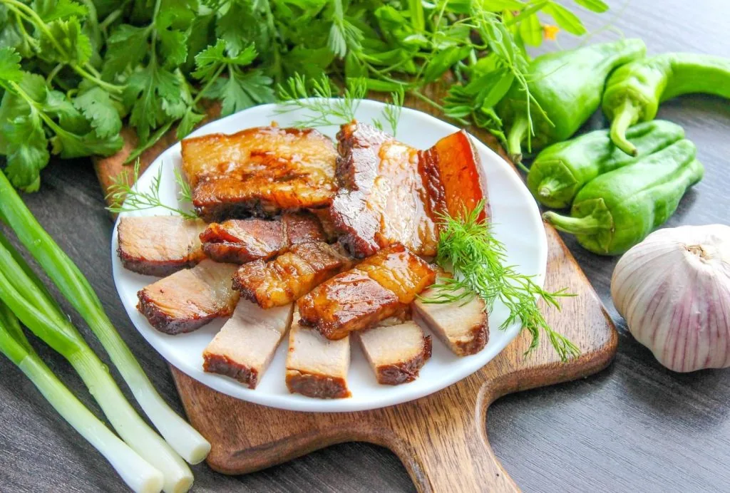 Переважно на ньому з’являються класичні салати, наприклад, знаменитий «Годинник», а також м’ясні закуски та холодець. Але сьогодні ми пропонуємо внести трохи несподіванки і приготувати сало варене у соєвому соусі – ніжне, ароматне та пікантне. Ця страва додасть новорічного настрою і стане родзинкою вашого меню.