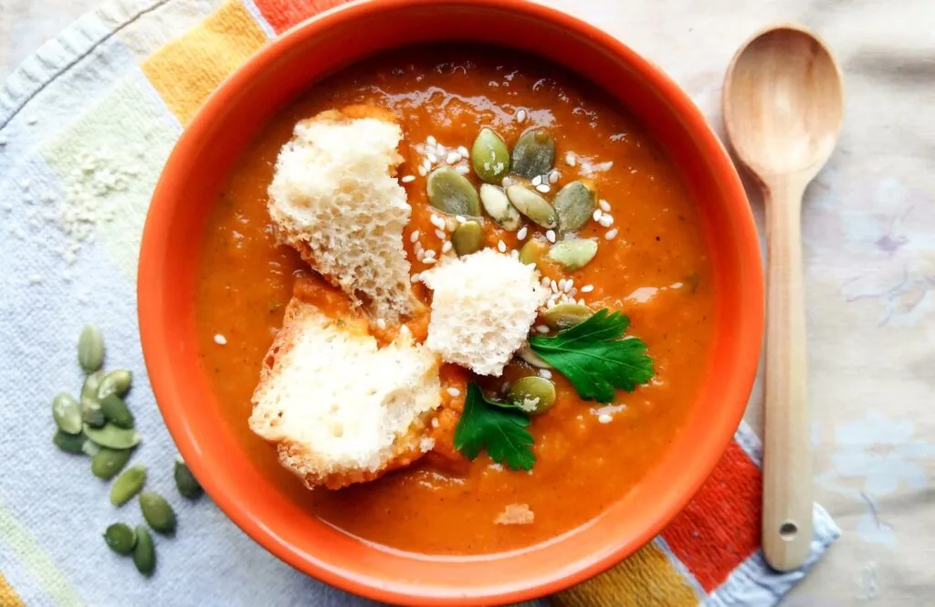 Зніміть з вогню, подрібніть блендером у пюре до гладкої текстури. Якщо суп занадто густий – додайте ще трохи бульйону. Влийте вершки, приправте сіллю, перцем і щіпкою мускатного горіха. Перемішайте. Подайте з підсмаженими сухариками, гарбузовим насінням або ложкою сметани.