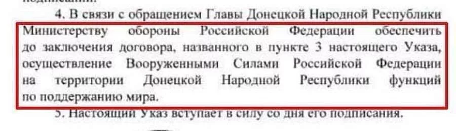 «У зв’язку зі зверненням Голови Донецької та Луганської Народних Республік Міністерству оборони Російської Федерації забезпечити до укладення договору, названого у пункті 3 цього Указу, здійснення Збройними Силами Російської Федерації на території Донецької Народної Республіки функцій щодо підтримання миру», – йдеться в указі