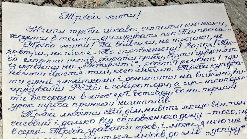 “В нас тато був в армії писарем, і так любив нас каліграфії вчити, прописи давав. Зараз таких нема, посадить і кожну буквочку щоб виводили. Добре що тако знати українську, розмовляти і грамотно писати”, — говорить жінка.