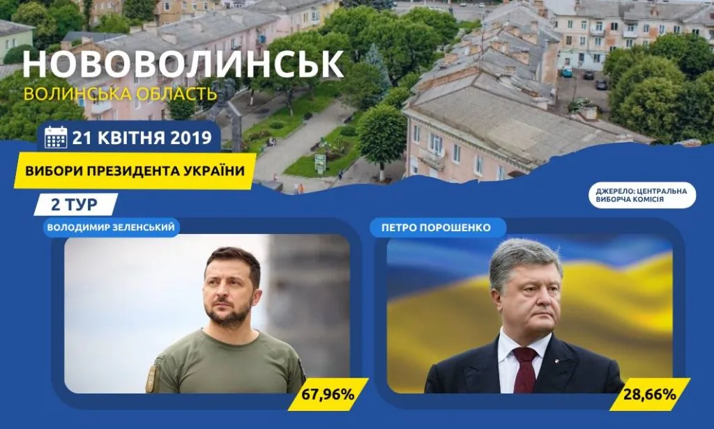 Зокрема у Нововолинську на всіх дільницях без виключення переважав Зеленський. Його частка голосів склала 67,96 %, Порошенка – 28,66%.