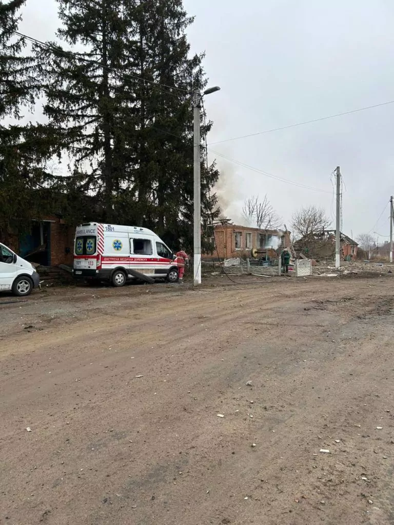 Пошкоджено одноповерховий будинок, де були медичні працівники, будівлі поруч, а також дві автівки “швидкої”.