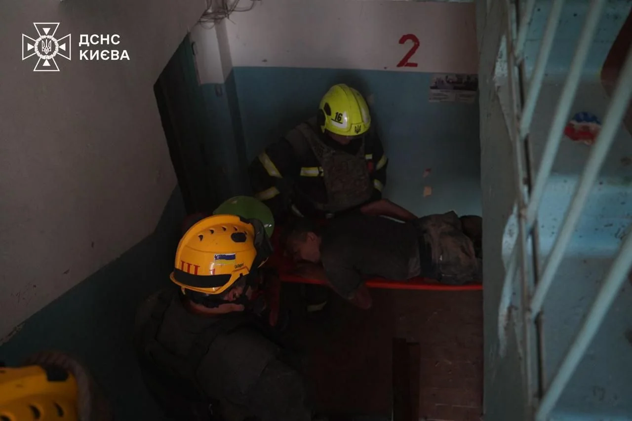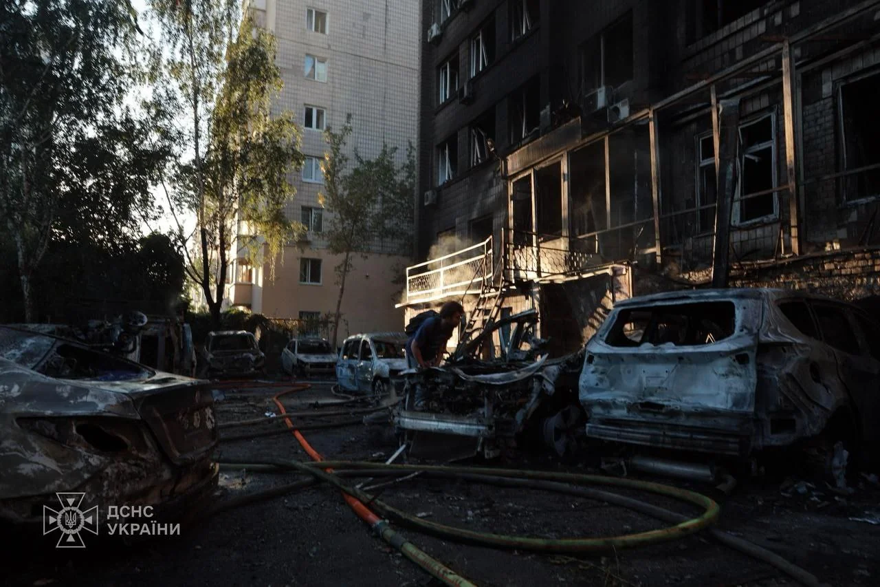 У Дніпровському районі пошкоджена житлова 25-поверхівка. Крім того, дрон влучив у двір поруч із 9-поверхівкою. На кількох локаціях у районі постраждали десятки автівок.