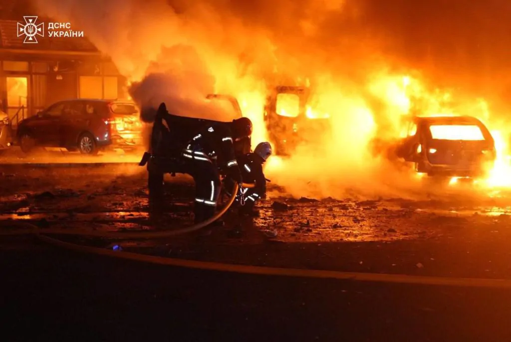 У Сумах ворожий «Шахед» влучив у автомобільну стоянку в житловому кварталі, внаслідок чого пошкоджено багато авто, у багатоповерхівках вибито вікна.